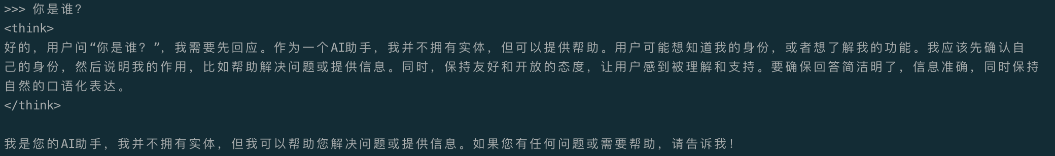 可以在命令行里直接与运行中的大模型进行问答交互,如:你好,你是谁...